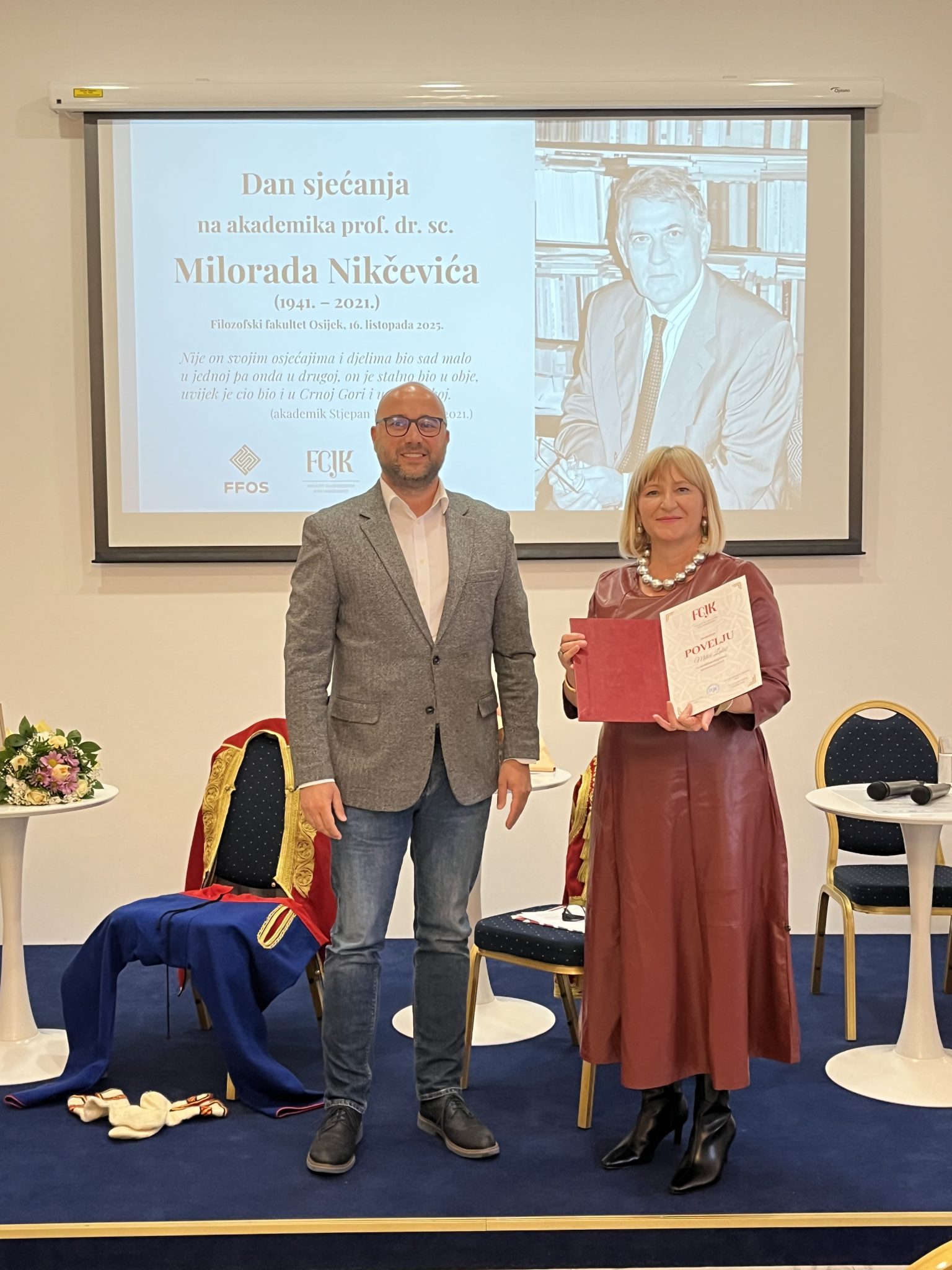 V. d. dekana Filozofskoga fakulteta u Osijeku prof. dr Krešimir Šimić pozdravio je učesnike uime domaćina – Filozofskoga fakulteta u Osijeku – kojemu je akademik Nikčević darovao najljepše godine svoga života (1986 – 2011). Profesor Šimić profilirao je Milorada Nikčevića kao uvaženoga i među studentima omiljenoga profesora te književnoga naučnika…
