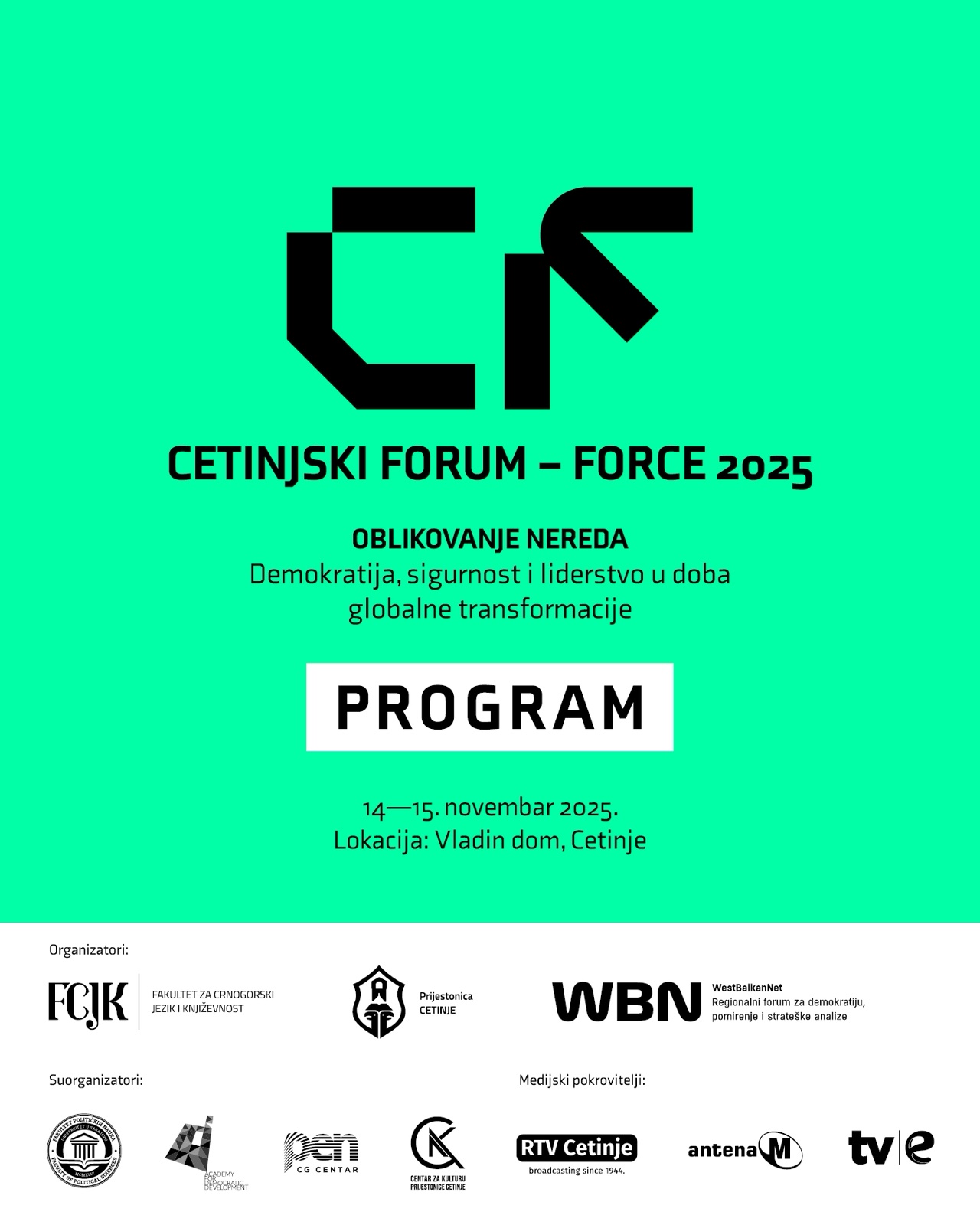 Događaj će okupiti brojne domaće i međunarodne stručnjake, diplomate, profesore i novinare, koji će tokom dva dana raspravljati o ključnim izazovima savremenih demokratskih društava. Forum se održava u Vladinom domu, u organizaciji Fakulteta za crnogorski jezik i književnost, Prijestonice Cetinje i WestBalkanNet-a, uz podršku Fakulteta političkih nauka Univerziteta u Sarajevu,...